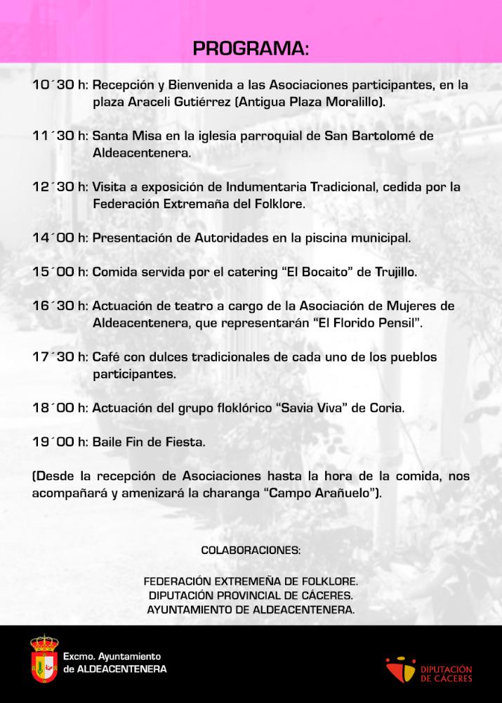 Programa de actividades de la XIX Convivencia Comarcal de mujeres, el 1 de junio de 2019, que tendrá lugar en Aldeacentenera, organizado por la Asociación de Mujeres de esta localidad.